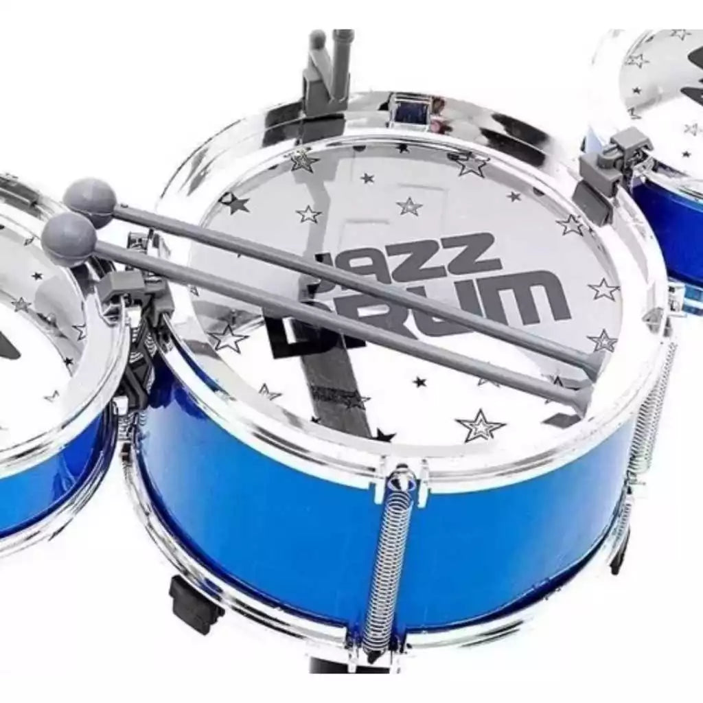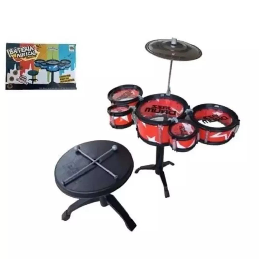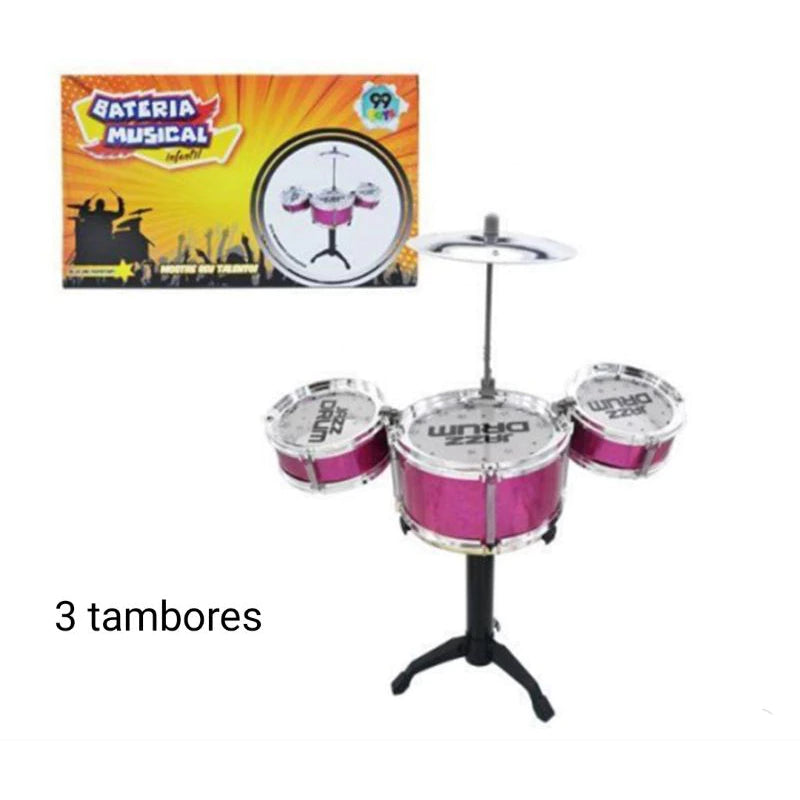 Esta bateria é perfeita para crianças pequenas que estão começando a explorar a música. inclui tambores, prato, baquetas, e banco. Recomendamos que a montagem seja feita por um adulto. Conteúdo da Embalagem bateria 5 tambores com banco: - 05 Tambores - 01 Estrutura - 01 Tripé para estrutura. - 01 Prato Fixo - 01 Suporte De Prato Fixo - 02 Baquetas - 01 Banquinho / Banqueta (suporta até 30 kg) Conteúdo da Embalagem bateria 5 tambores sem banco: - 05 Tambores - 01 Estrutura - 01 Tripé para estrutura. - 01 Prato Fixo - 01 Suporte De Prato Fixo - 02 Baquetas Conteúdo da Embalagem bateria 3 tambores sem banco: - 03 Tambores - 01 Estrutura - 01 Tripé para estrutura. - 01 Prato Fixo - 01 Suporte De Prato Fixo - 02 Baquetas Dimensões: Bateria 43 cm Altura X 40 cm Comprimento Banquinho 20 cm Altura X 19 cm Comprimento