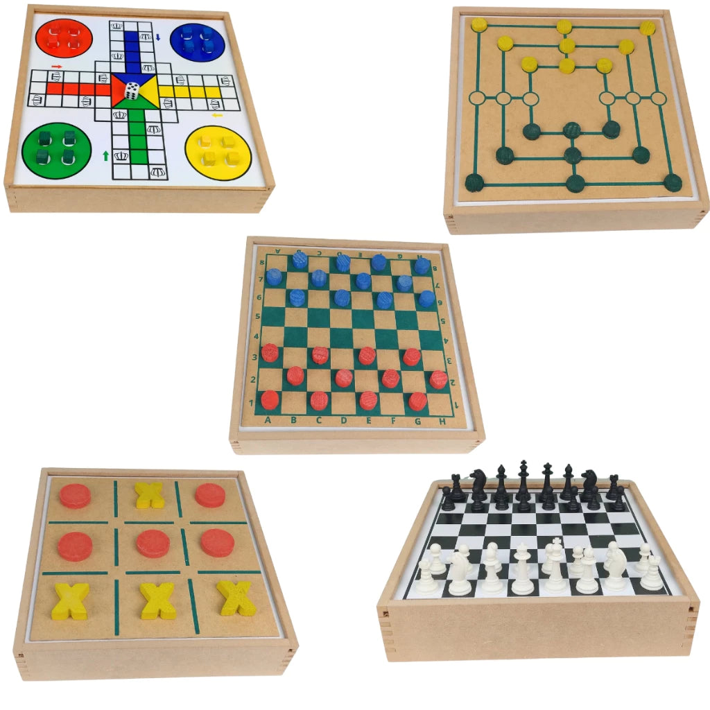 TABULEIRO JOGOS CLÁSSICOS 5 EM 1 EM MADEIRA MDF. Conjunto contendo cinco jogos: Damas Trilha Jogo da velha Xadrez Ludo Confeccionado em MDF e Madeira, impresso em cores. Desenvolve o raciocínio estratégico; as possibilidades matemáticas; o cumprimento de regras. Pçs Xadrez poliuretano, Trilha eva, Dama madeira, Ludo Madeira, Jg da velha madeira Medidas embalagem: 28x28x07cm Tabuleiros internos 26x26 Peso aproximado: 1.715 Kg Fabricante Zaramela Brinquedos.