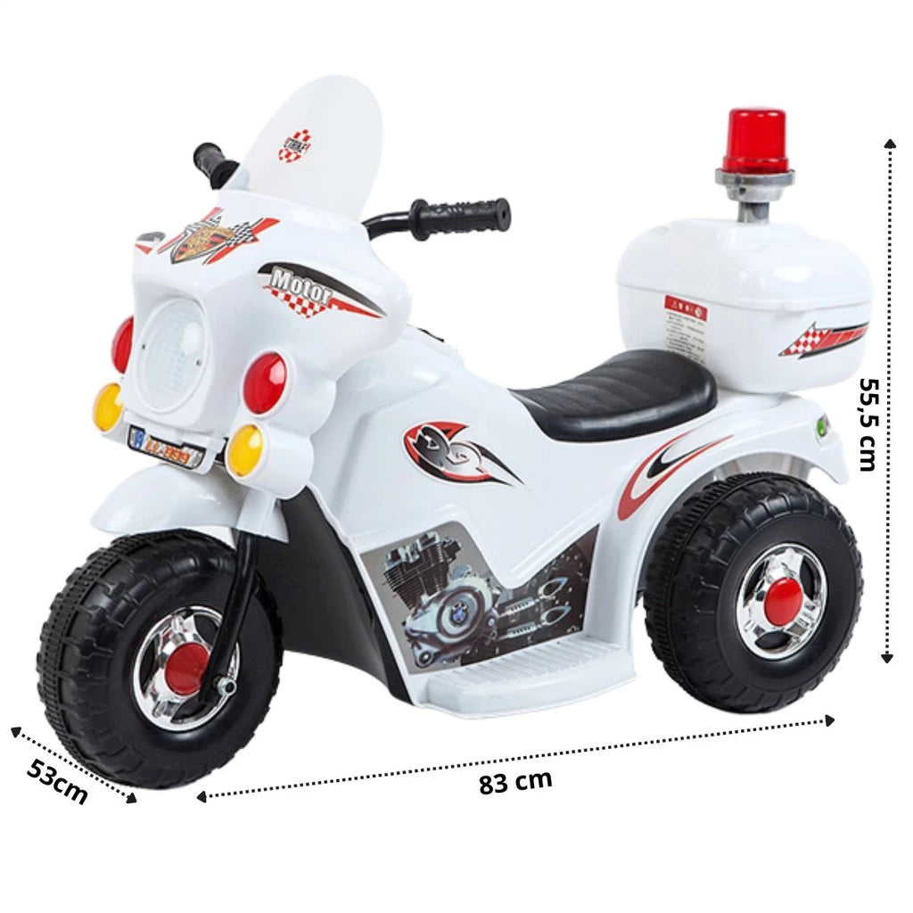 O anúncio contém: 01 Mini Moto Infantil com Baú. Perguntas frequentes: Já vem montada? Ela vem pré-montada; Suporta até quantos quilos? Suporta até 25Kg; Pode molhar? Não é recomendado; Possui luzes? Sim; Tem sons? Sim; Tem entrada para pen drives? Não. As crianças vão amar essa incrível e super divertida Mini Moto elétrica infantil, com uma bateria de 6V ele pode alcançar até 5km/h, a diversão estará garantida por muito tempo graças a sua bateria com duração de 40/60 minutos. Possui pedal/acelerador priorizando a segurança. Com detalhes incríveis, os pequenos irão se sentir um policial de verdade, possui um giroflex com som de sirene e um lindo baú para poder guardar objetos. Benefícios: -Seguro e divertido; -Pedal acelerador; -Acompanha carregador e bateria; -Luzes e sons. Informações: Dimensões aproximadas da moto (AxLxC): 57cm x 45cm x 88cm; Peso do Produto: 4,4 Kg; Idade Recomendada: Crianças à partir de 3 anos; Peso máximo suportado: 25Kg; Velocidade atingida: de 3 a 5km/h; Tempo aproximado de funcionamento: 40/60 minutos; Carregador: Bivolt; Bateria: 6V; Botão de selecionar velocidade: Não; Pedal acelerador: Sim; Direções da moto: Frente e Ré; Luz: Sim, no farol dianteiro; Som: Sim, som de sirene; Tempo para carregar a bateria: 04 à 06 horas; Material: Plástico, metal, componentes eletrônicos; Modelo: Mini Moto Elétrica Infantil com Baú; INMETRO: 9010-2022-BRI-1 Fabricante: Zippy Toys;