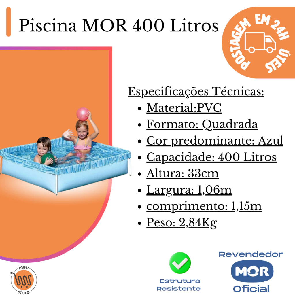 PISCINA INFANTIL 400 LITROS - MOR PRODUTO ORIGINAL E A PRONTA ENTREGA Os pequenos vão adorar essa piscina! Com capacidade para 400 litros, ela é prática de ser transportada e montada em qualquer lugar, excelente para quem tem pouco espaço em casa. Fabricada com lona resistente com estampa em ondas e estrutura firme, proporciona segurança e garante momentos de alegria nos dias de calor. Constituída de estrutura em aço com acabamento em pintura epóxi à pó branca, a piscina 400 litros da Mor possui peças plásticas em polipropileno com sistema de encaixe, que facilitam a montagem. Atenção! A lona em PVC é leve e resistente, mas a piscina não deve ser transportada com água em seu interior. Proteja sempre o piso para evitar objetos pontiagudos que possam perfurar o material. Agora é só curtir os melhores momentos do verão ao lado da criançada! Atenção! Nunca deixe crianças sozinhas perto da água sem supervisão de um adulto. CARACTERÍSTICAS DO PRODUTO: Tipo de Material: PVC Cor: Azul Capacidade: 400 litros Peso: 2,79 Kg DIMENSÕES DO PRODUTO: Altura: 33 cm Largura: 1,04 m Comprimento: 1,15 m MOR: A MOR nasceu no município de Santa Cruz do Sul, começando como uma empresa familiar. Inicialmente fabricavam produtos para apicultura, em uma pequena metalúrgica no início dos anos 60. Hoje, com mais de 50 anos de história a empresa cresceu e se firmou no mercado de produtos para casa, camping e lazer.